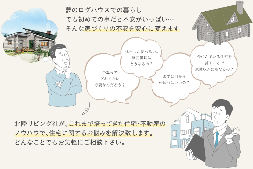 仕事も子育ても一段落し使える時間が自由になった今、働いているときには出来なかった趣味や自然豊かな場所でスローライフに過ごす夢を叶えませんか?男の隠れ家の提案するログハウスは、憧れの別荘暮らしがリーズナブルに実現できるプランです。北陸リビング社は、ログハウスを購入に至るまでのあなたの不安を解消するアドバイスとサポートをさせて頂きます。